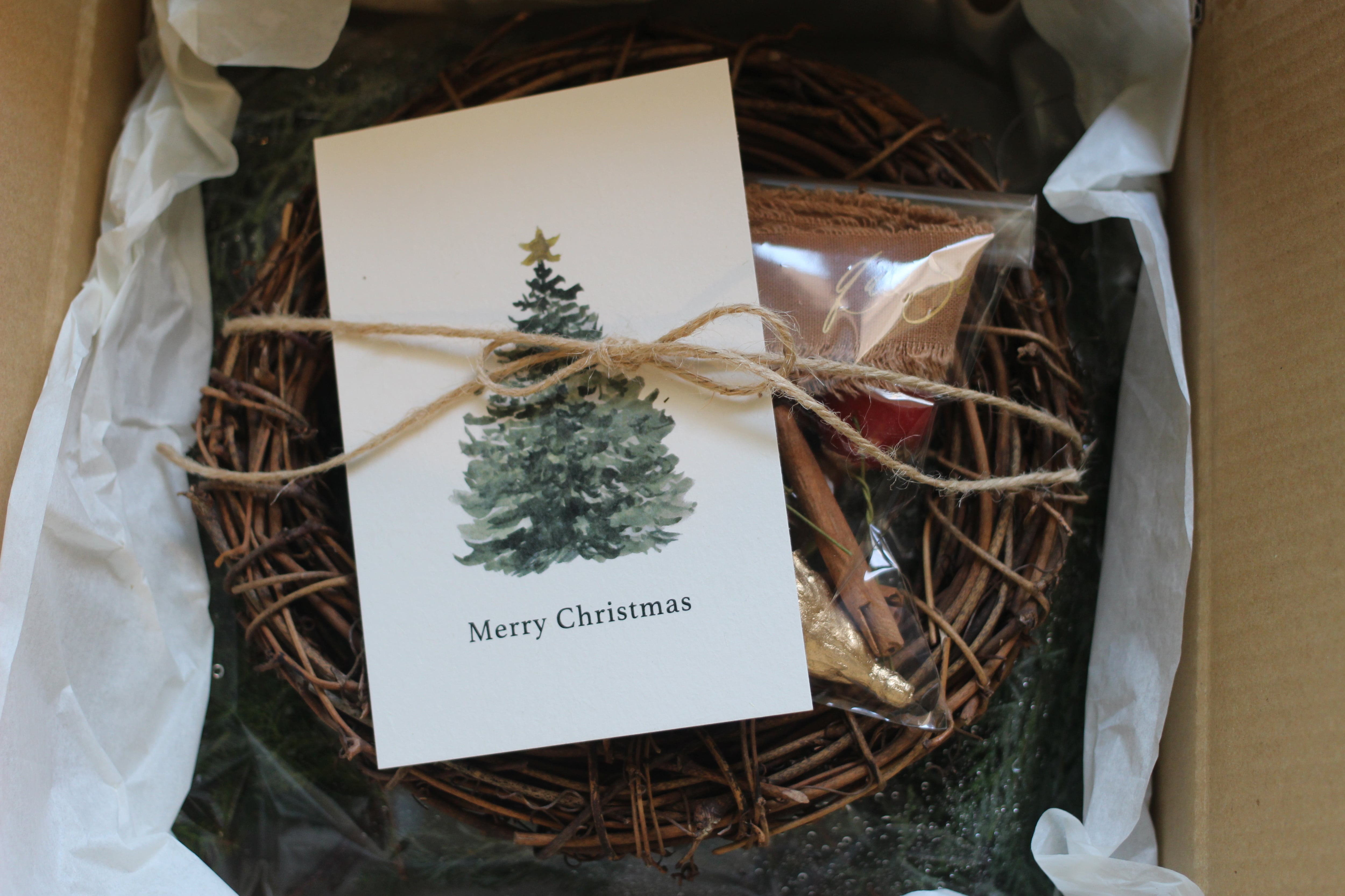 クリスマスリース作成に必要な素材が全て揃っています。beekセレクトの可愛らしいオーナメントを入れてお届けします。